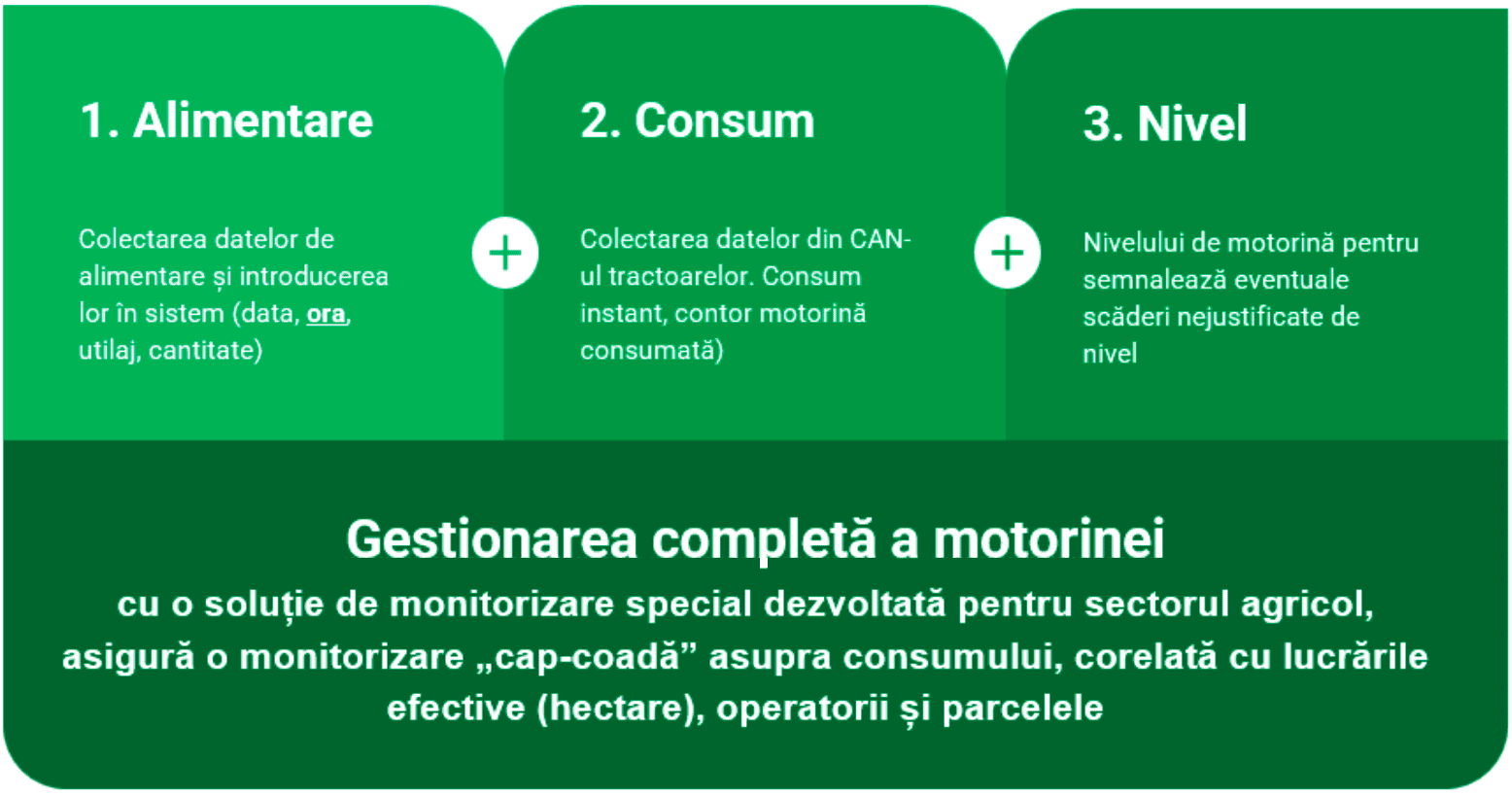 Combinăm sursele pentru o imagine completă: consum în lucrare, staționare și transport, cu validare pe poziție (stație/cisternă).