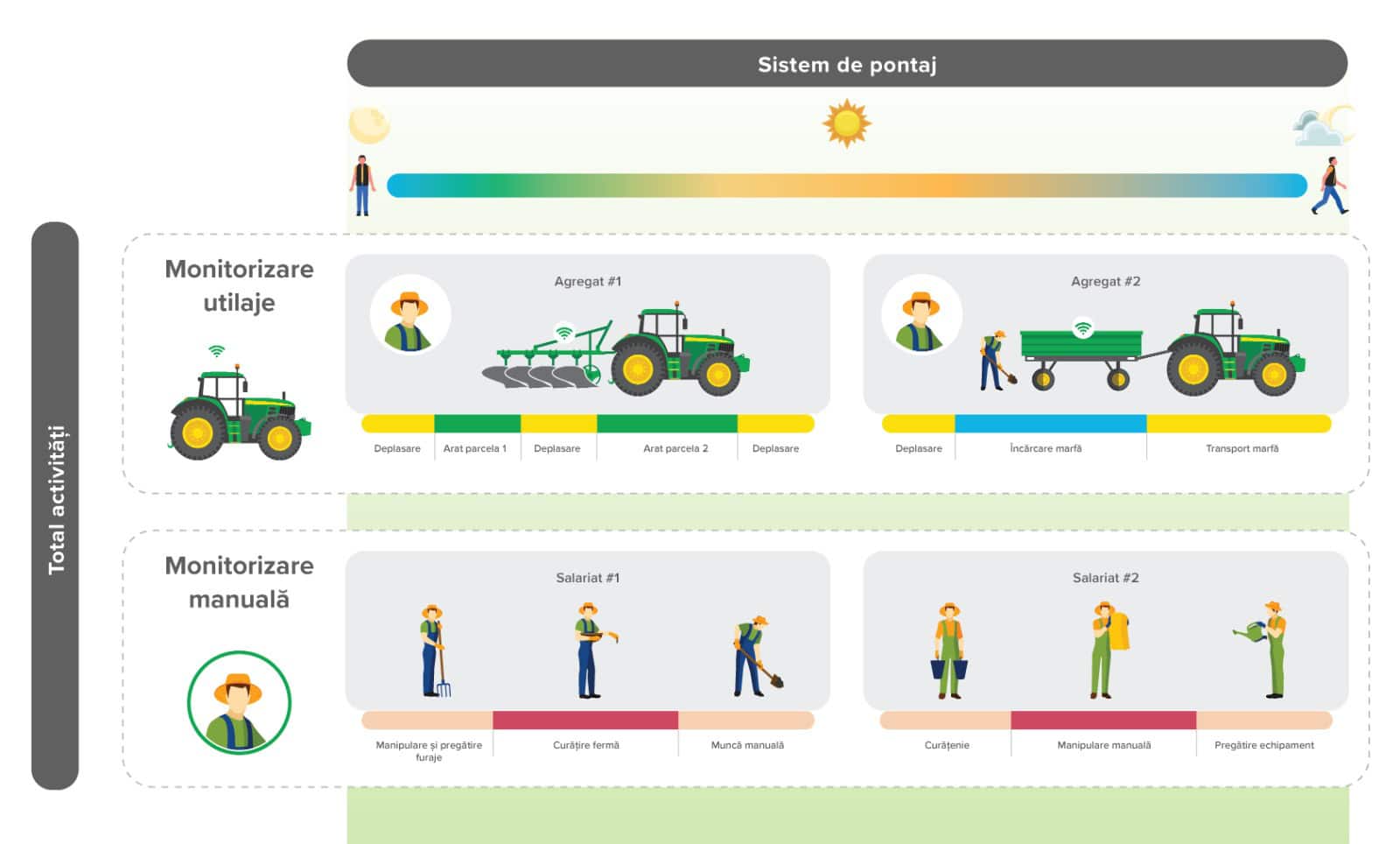 monitorizezi ha/oră și timpii productivi vs. neproductivi; reduci staționările și deplasările inutile.